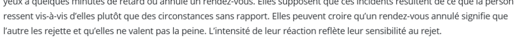 « Elles peuvent croire qu’un rendez-vous annulé signifie que l’autre les rejette et qu’elles ne valent pas la peine « . (lien avec le premier rdv psychiatre, voire plus haut, et encore une probabilité de confusion).