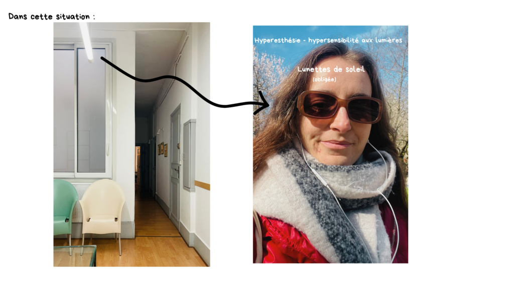 “C’est parce que les put**** de néons dans la salle d’attente me défoncent les yeux”. L’hypersensibilité sensorielle ne m’aide pas à ce niveau. Je dois me protéger des néons, car je risque la migraine ophtalmique et une grande fatigue.